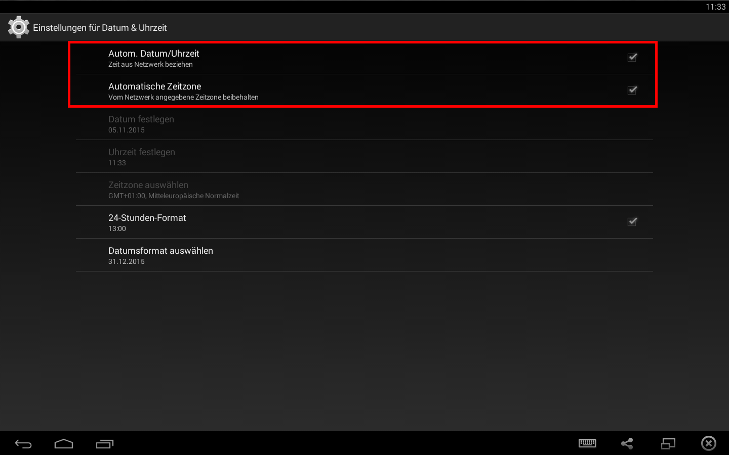 Bitte bereiten Sie das Android-Gerät für das einwandfreie Abspielen Ihrer Playlisten über die Cloud vor, indem Sie die Einstellungen aufrufen und unter System → Einstellungen für Datum & Uhrzeit die Optionen → Automatische Datum/Uhrzeit sowie → Automatische Zeitzone aktivieren.