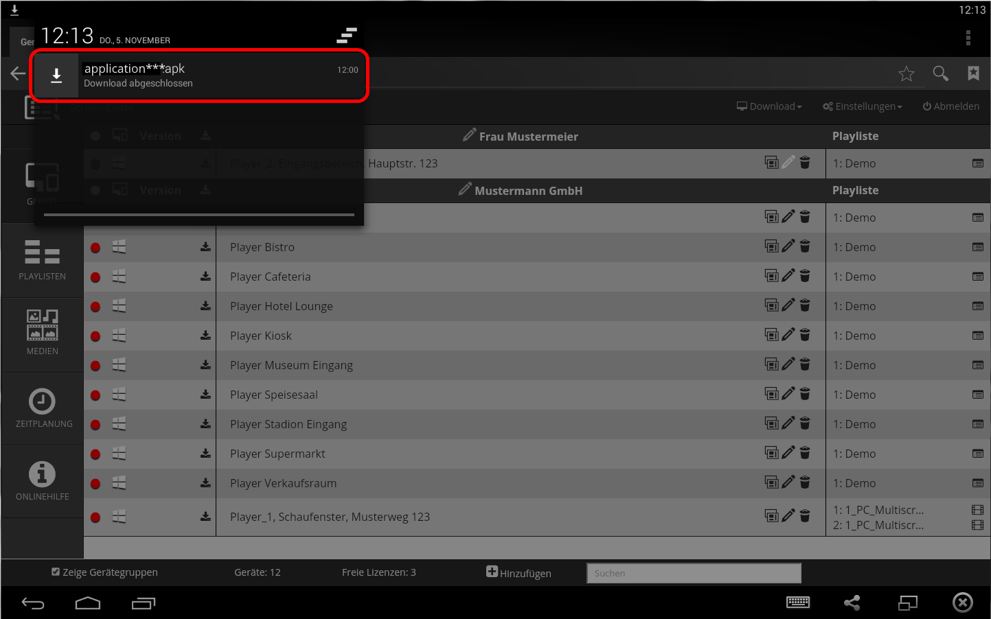 Klicken Sie auf den Menüpunkt Android Player um den Download der Android Player Anwendung zu veranlassen. Der Vorgang des Downloads wird Ihnen dann durch einen animierten Pfeil in der Benachrichtigungsleiste angezeigt.