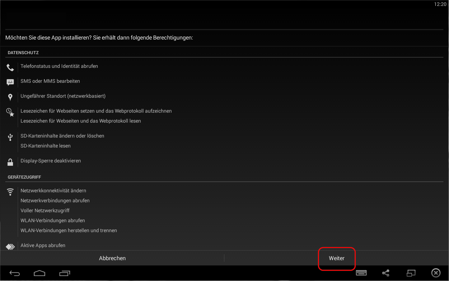 Es erscheint ein Dialogfenster mit der Frage Möchten Sie diese App installieren?. Sie können dort die Berechtigungen der App einsehen, die sich auf den Datenschutz und Gerätezugriff beziehen. Tippen Sie nach Durchsicht auf → Weiter um den Installationsvorgang zu starten.