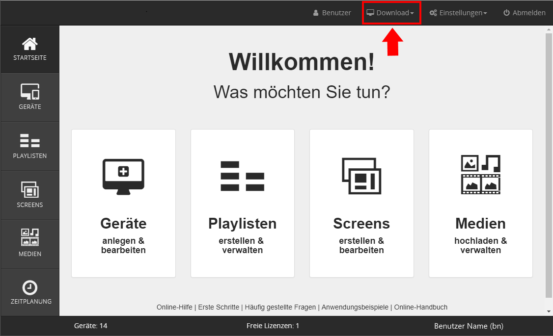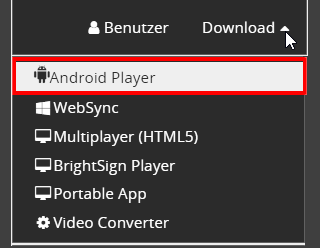 Melden Sie sich auf dem Android-Gerät auf Ihrem Cloud-Konto an. In der oberen Leiste der Startseite finden Sie die Funktion Download. Öffnen Sie das Drop-Down-Menü durch Klick auf das Dreieck und wählen Sie den Menüpunkt Android Player.