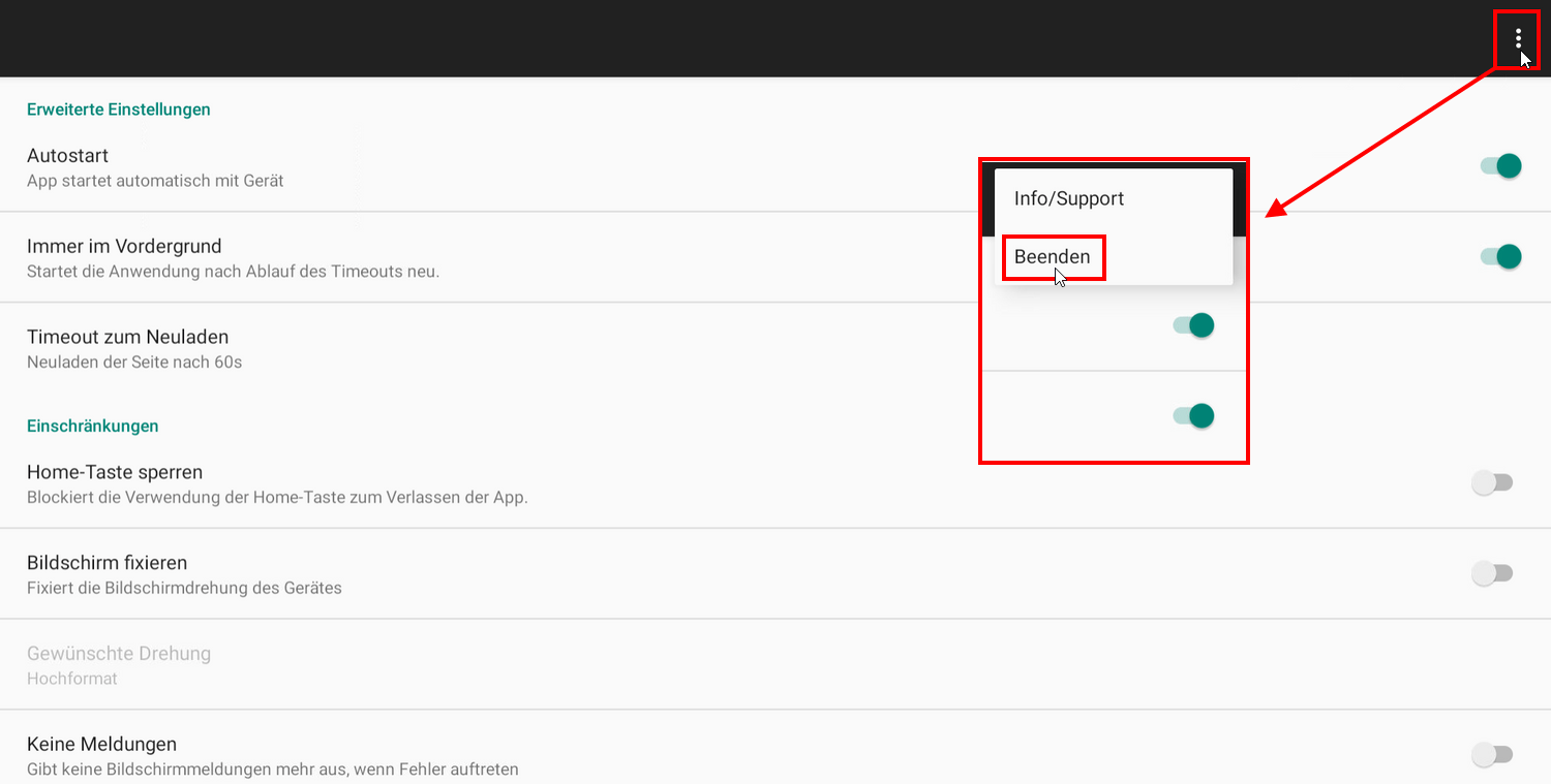 Tippen Sie rechts oben auf die 3-Punkte Funktion um das Menü zu öffnen und wählen Sie dann → Beenden.