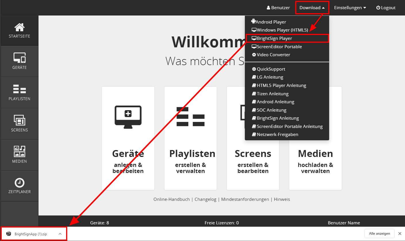 1. Download der BrightSign App vom Webportal