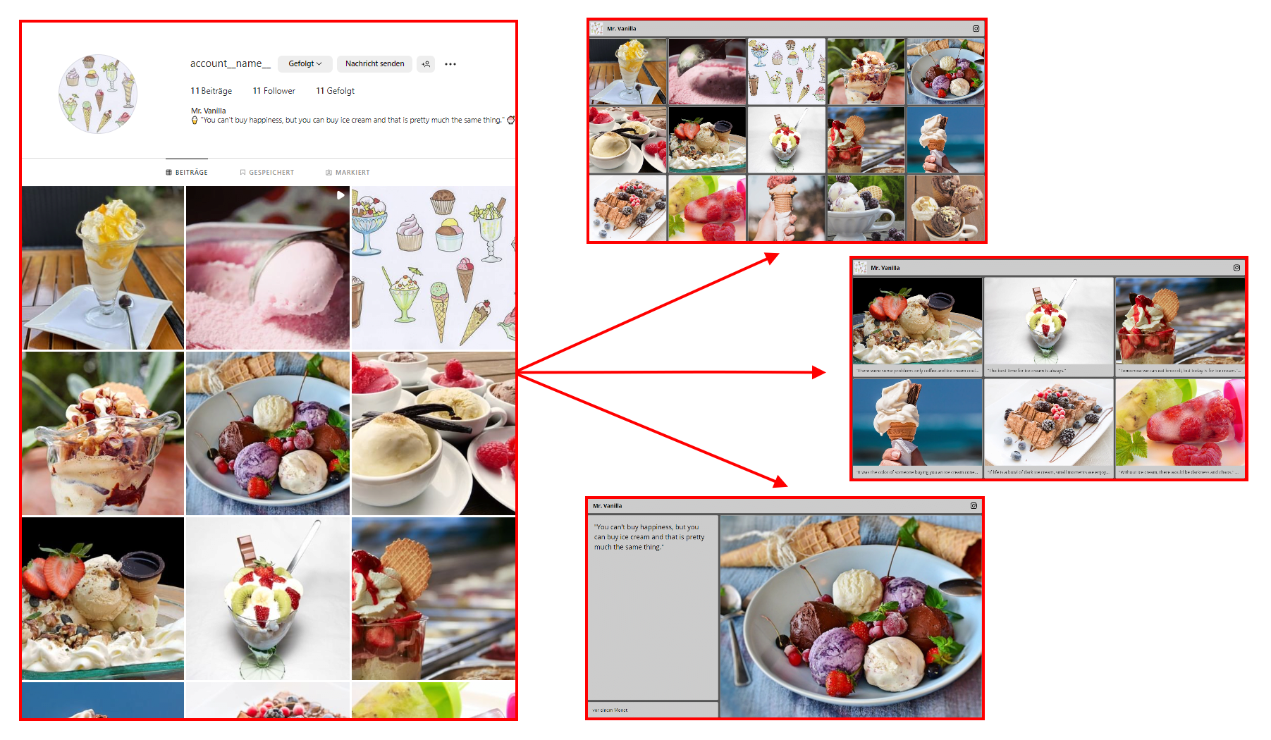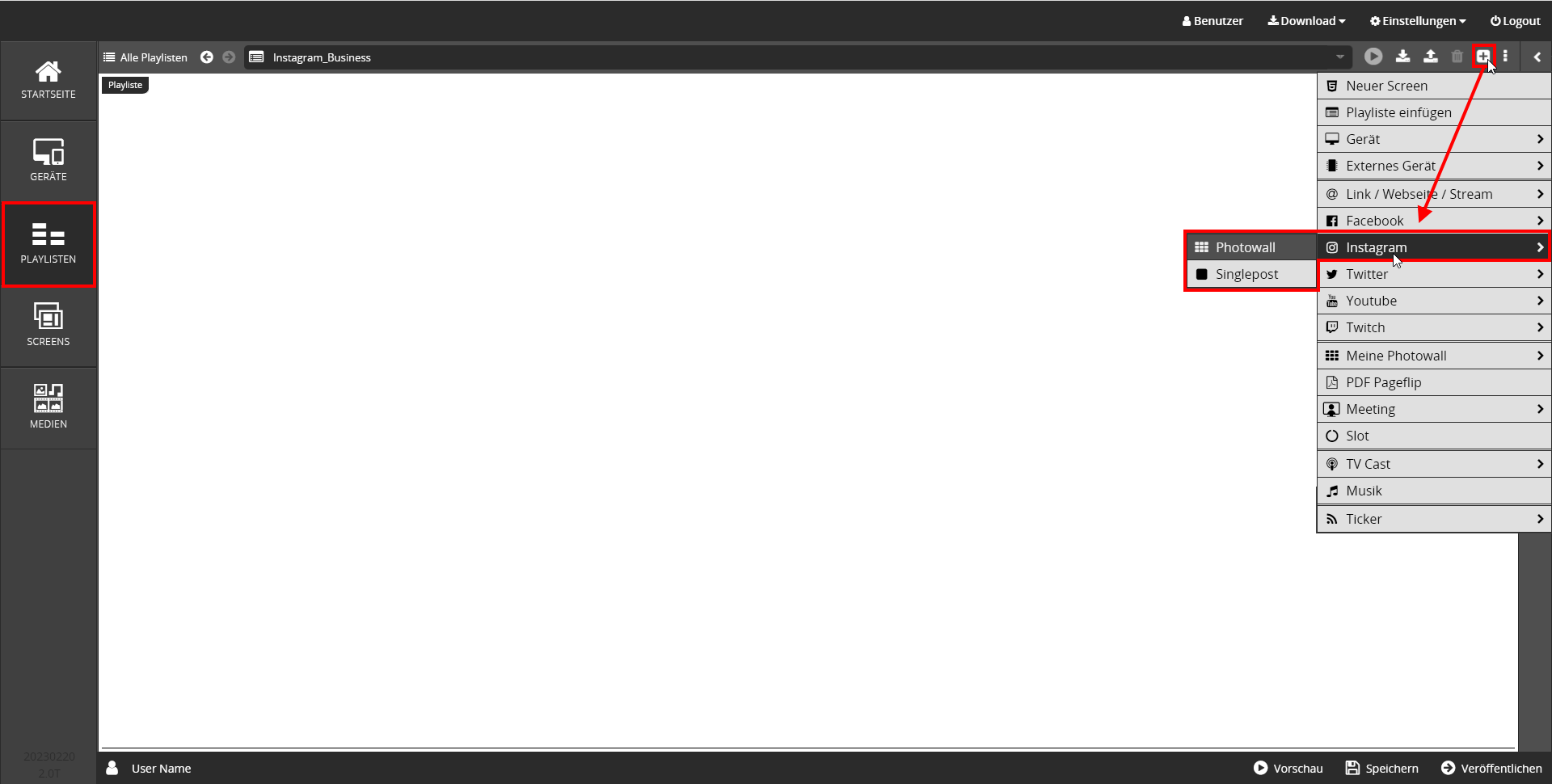in Playlisten. - Gehen Sie auf den Menüpunkt → Instagram. Sie können dann die Option Photowall (Ansicht mehrerer Instagram Posts) oder die Option Singlepost (Einzelansicht eines Instagram Posts) wählen.