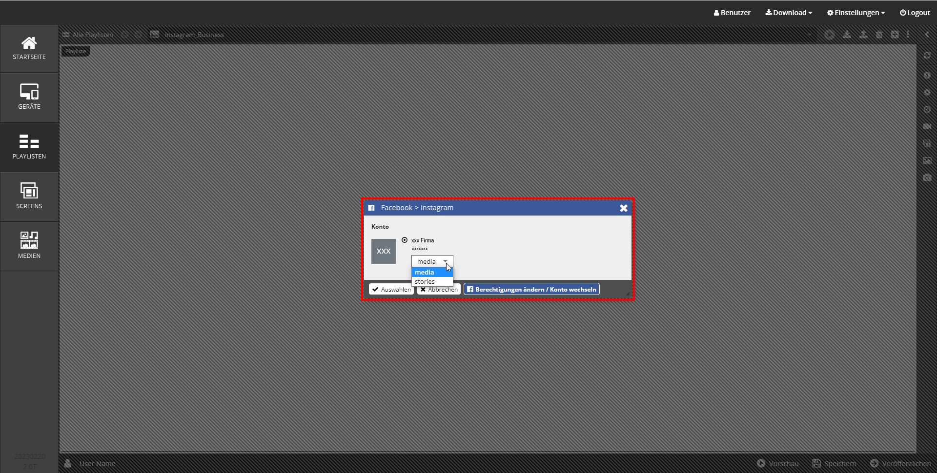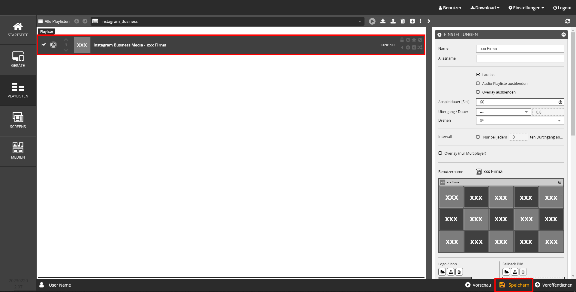- Jetzt sehen Sie das fertige Instagram Playlistenelement in Ihrer Playliste. Bei Bedarf können Sie unter → Einstellungen weitere Anpassungen zur Anzeige der Instagram Posts vornehmen.