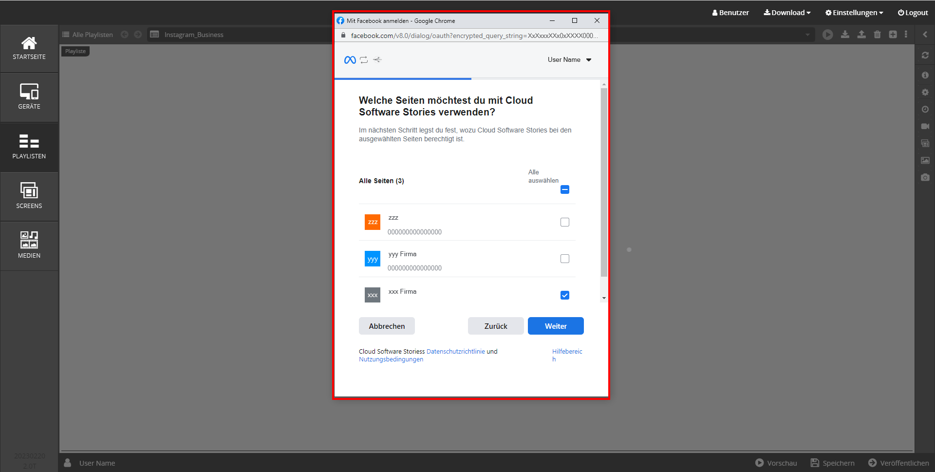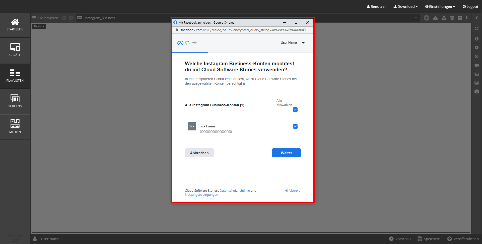 - Wählen Sie das Instagram Business Konto, das Sie mit der Cloud Software verwenden möchten durch Klick in das Kästchen aus. Klicken Sie danach auf → Weiter.
