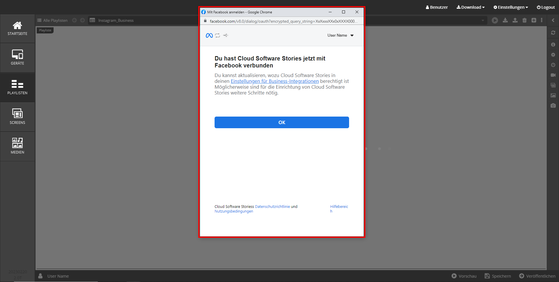 - Sie erhalten nun die Bestätigung der Verbindung zu Facebook. Klicken Sie auf → OK.