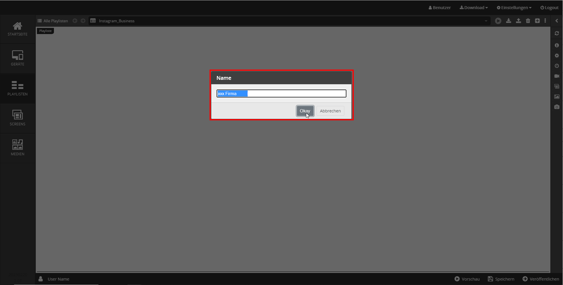 - Klicken Sie abschließend entweder auf → Speichern um Ihre Änderungen zu sichern oder auf → Veröffentlichen um die Playliste zu speichern und zum Abspielen auf Ihrem Ausgabegerät freizugeben.