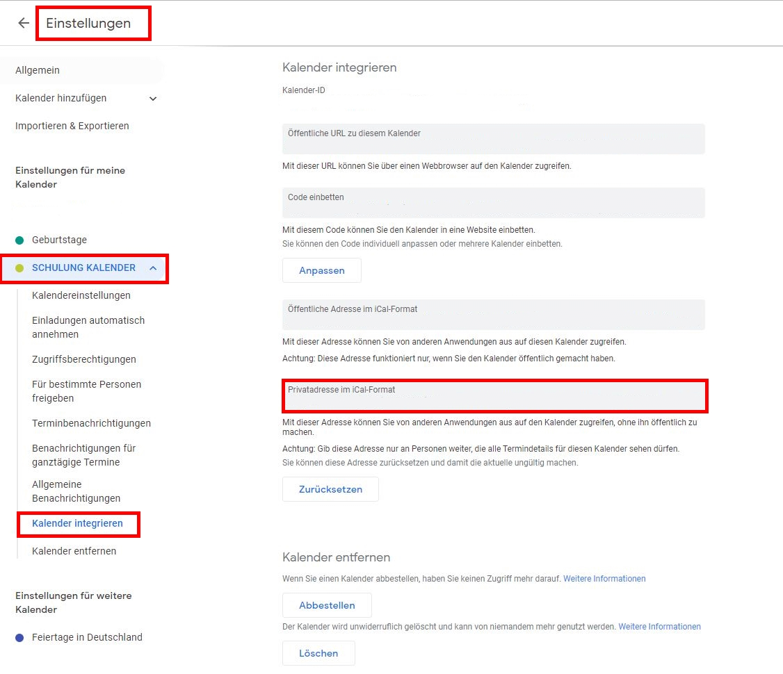 - Kopieren Sie den Link unter → Privatadresse im iCal-Format.