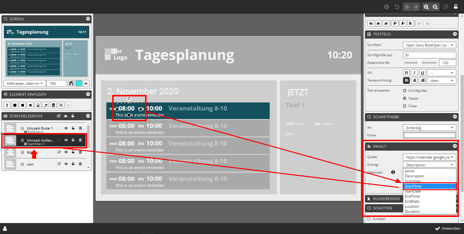 Sie haben im vorherigen Schritt das Element selektiert, das den Beginn der Veranstaltung zeigen soll → Uhrzeit Anfang, wählen Sie deshalb bitte den Menüpunkt → StartTime .