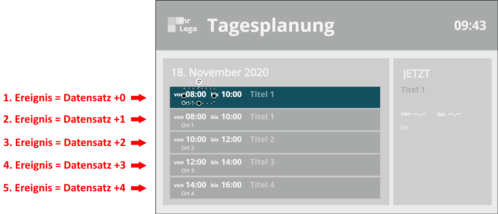 Bei den Elementen, die das jüngste Ereignis (= erster Kalendereintrag) anzeigen sollen, beginnen Sie mit der Zuordnung des Datensatzes +0.