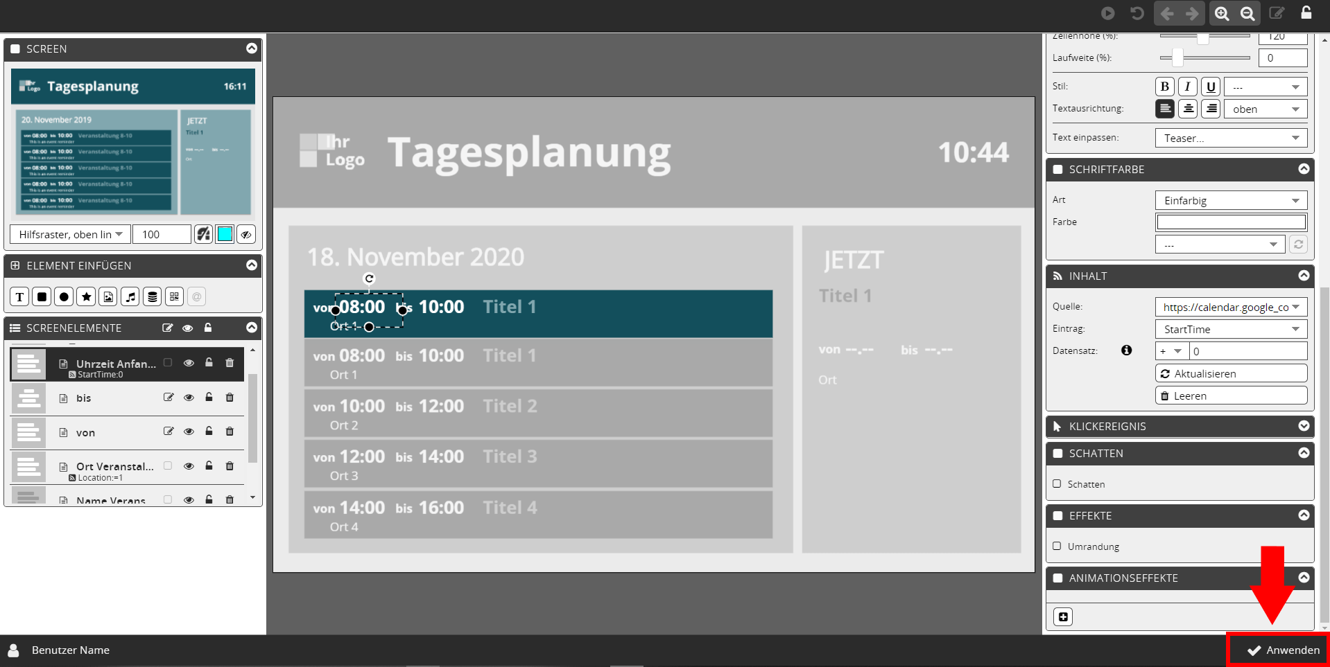 - Zum Beispiel den Eintrag/das Element, das den Beginn der Veranstaltung zeigen soll = Uhrzeit Anfang