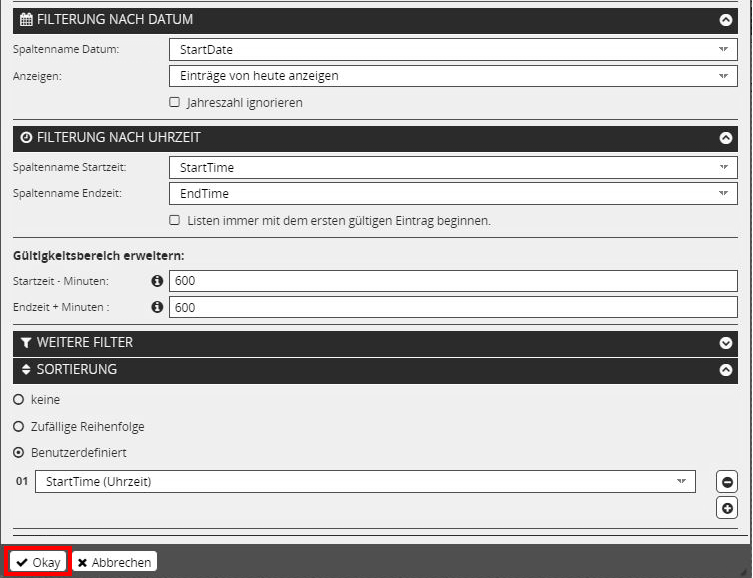 Wählen Sie die Art der Sortierung, in der die Inhalte angezeigt werden. In unserem Beispiel wurden die Einträge in der Reihenfolge der Startzeit des Events aufsteigend sortiert, beginnend mit dem frühesten Event.