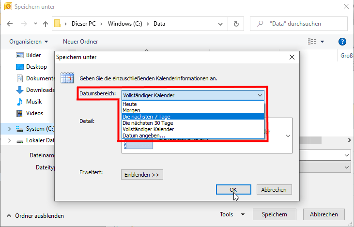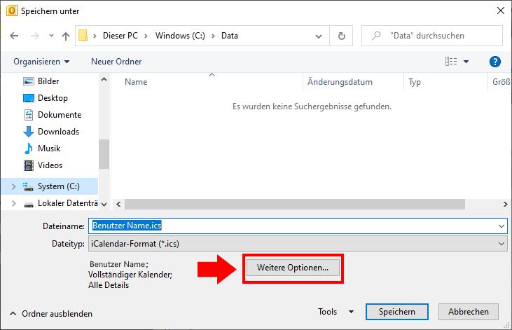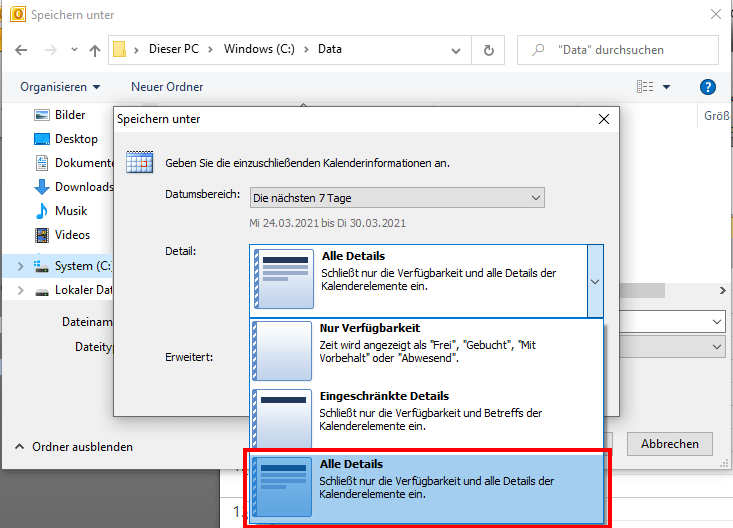 Zur Vorbereitung auf den in dieser Anleitung folgenden 3. Schritt, speichern Sie Ihren Outlook Kalender bitte in den Dateiordner → C://Data.