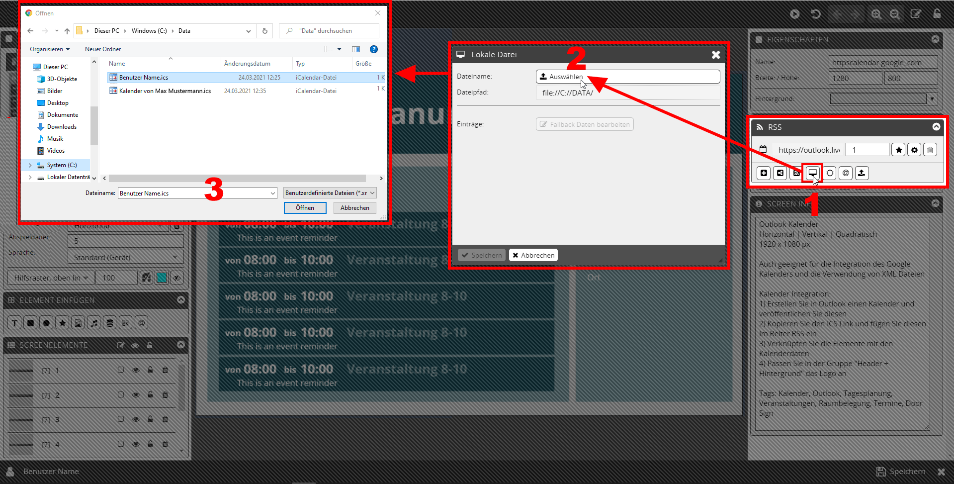 - Wählen Sie aus dem Ordner → Data den Kalender aus, den Sie einfügen möchten. Dateipfad: Dieser PC → Windows (C:) → Data.