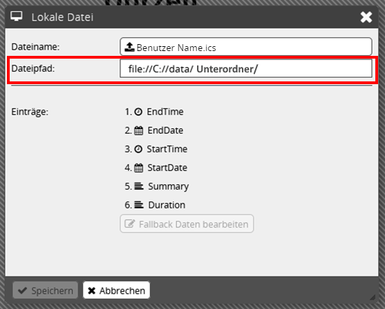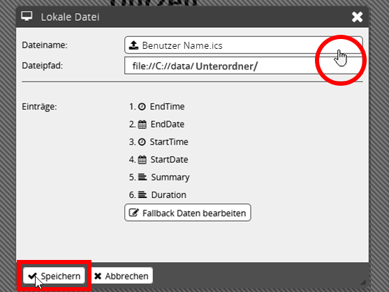 Sollten Sie die Kalender-Datei in einen Unterordner des Ordners → C://data abgelegt haben, dann nehmen Sie unter Dateipfad die Anpassung zum Ordner vor.