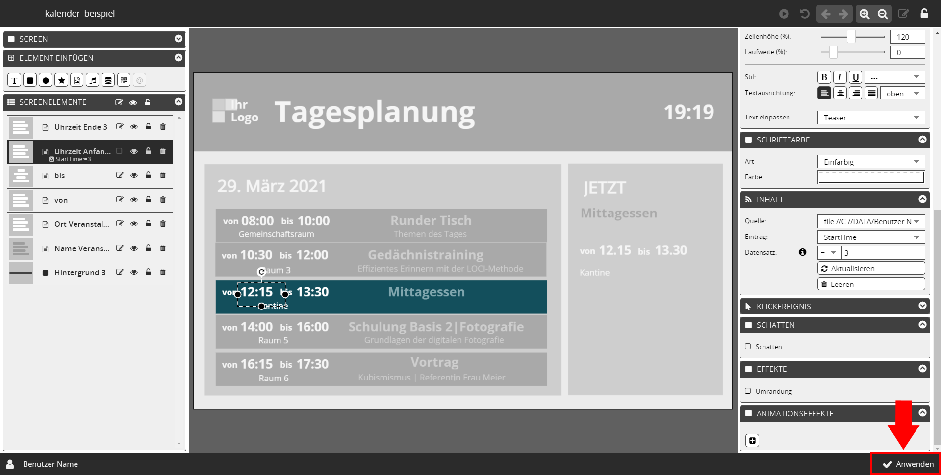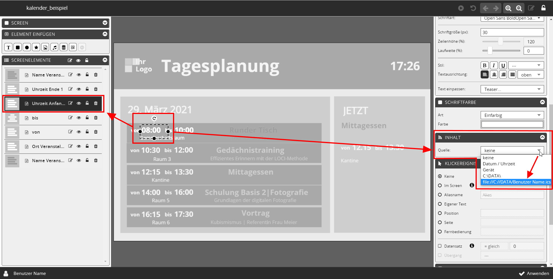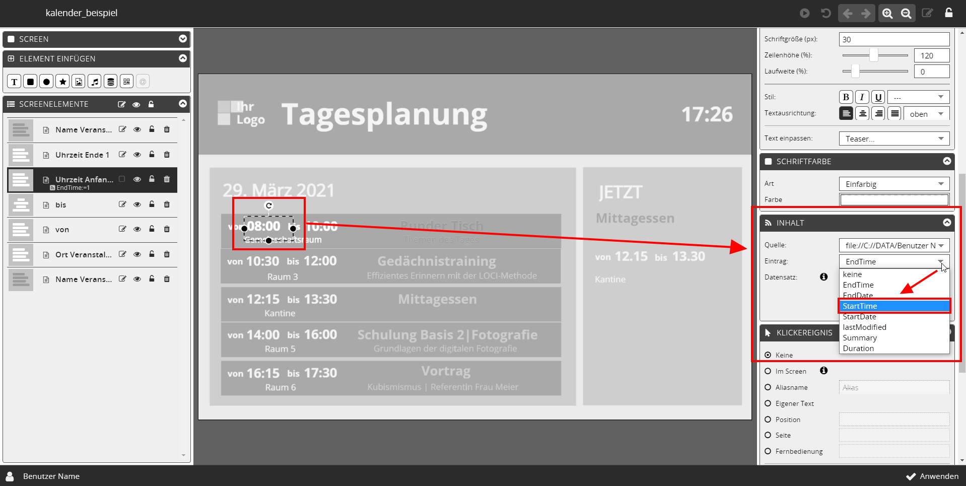 Sie haben im vorherigen Schritt das Element selektiert, das den Beginn der Veranstaltung zeigen soll → Uhrzeit Anfang, wählen Sie deshalb bitte den Menüpunkt → StartTime .