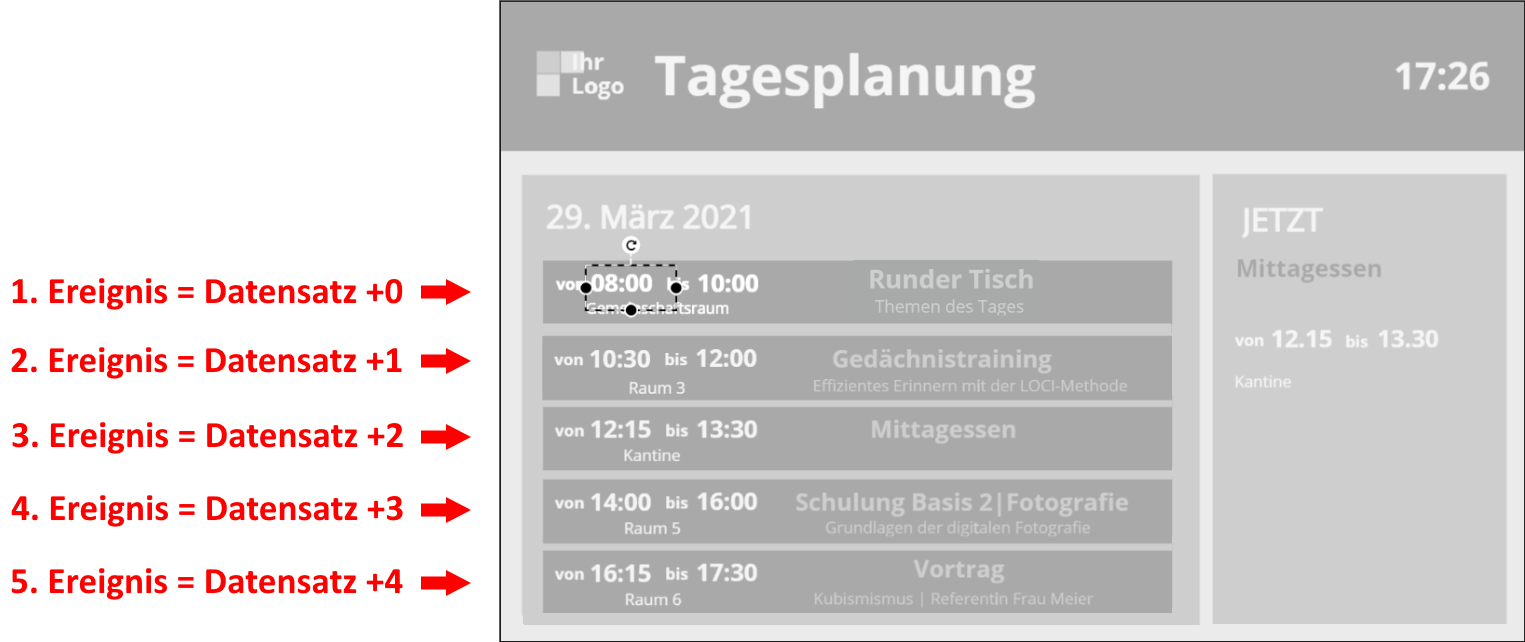 Für die Elemente, die das zweite Kalenderereignis = die nächst folgende Veranstaltung anzeigen sollen, wählen Sie den Datensatz +1 aus.