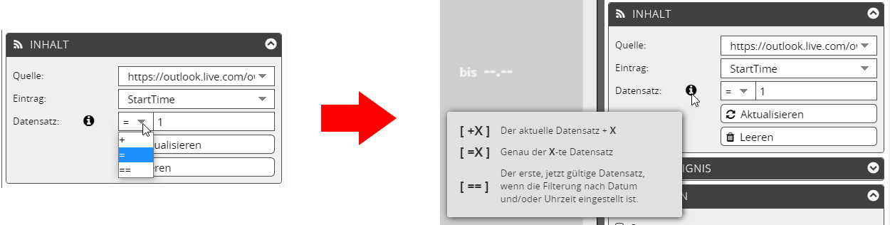 Bei den Elementen, die das jüngste Ereignis (= erster Kalendereintrag) anzeigen sollen, beginnen Sie mit der Zuordnung des Datensatzes +0.