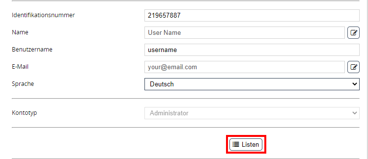 Diese Daten wurden bereits bei der Erstellung Ihres Accounts hinterlegt. Der Benutzername ist nicht veränderbar. Der Name und die Mailadresse kann von Ihnen im Nachhinein angepasst werden. Unter dem Bereich der individuellen Daten wie Identifikationsnummer, Name, Benutzername, E-Mail und Sprache finden Sie die Funktion → Listen.