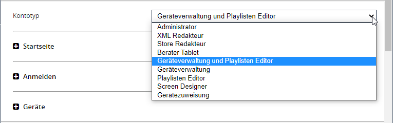 Dem Accountadministator ist automatisch der Kontotyp → Administrator vergeben, da dieser über alle Rechte des Accounts verfügt. Demzufolge ist dieser Bereich entsprechend inaktiv.