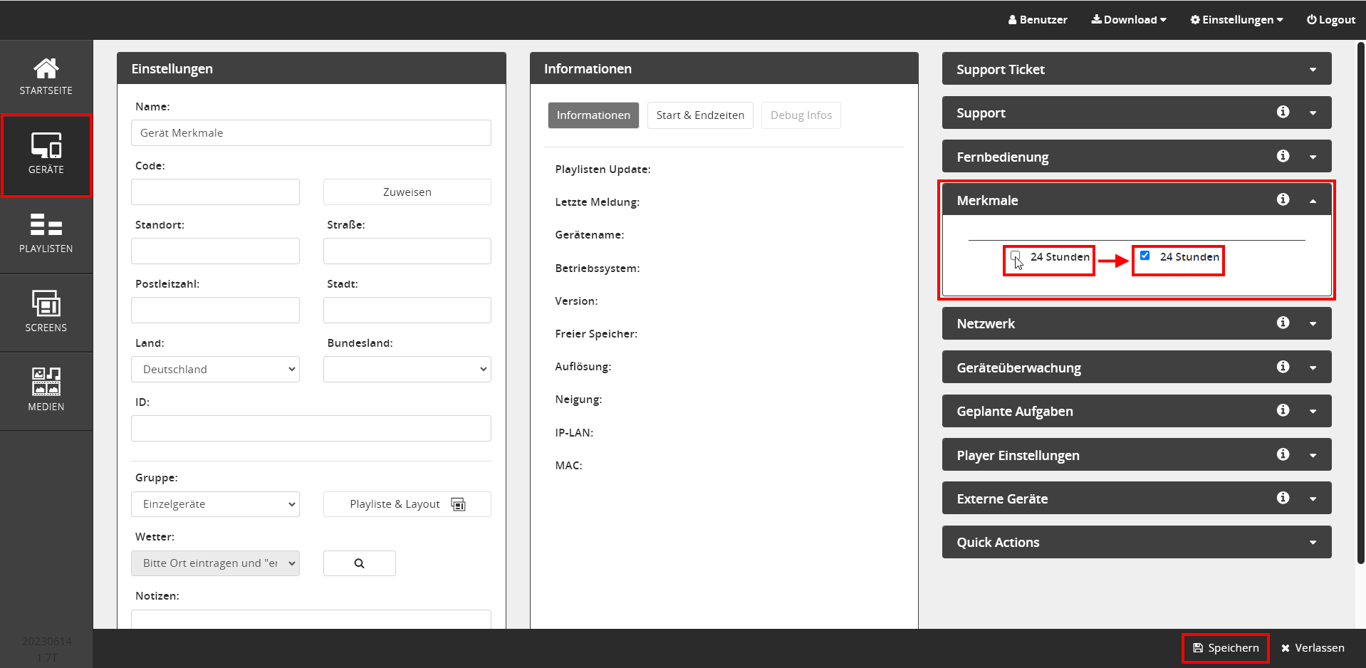 Hinweis: Das Feature Merkmale ist für die Betriebssysteme BrightSign, LG WebOS, Windows Multiplayer, Samsung SoC, Samsung TizenPro verfügbar.