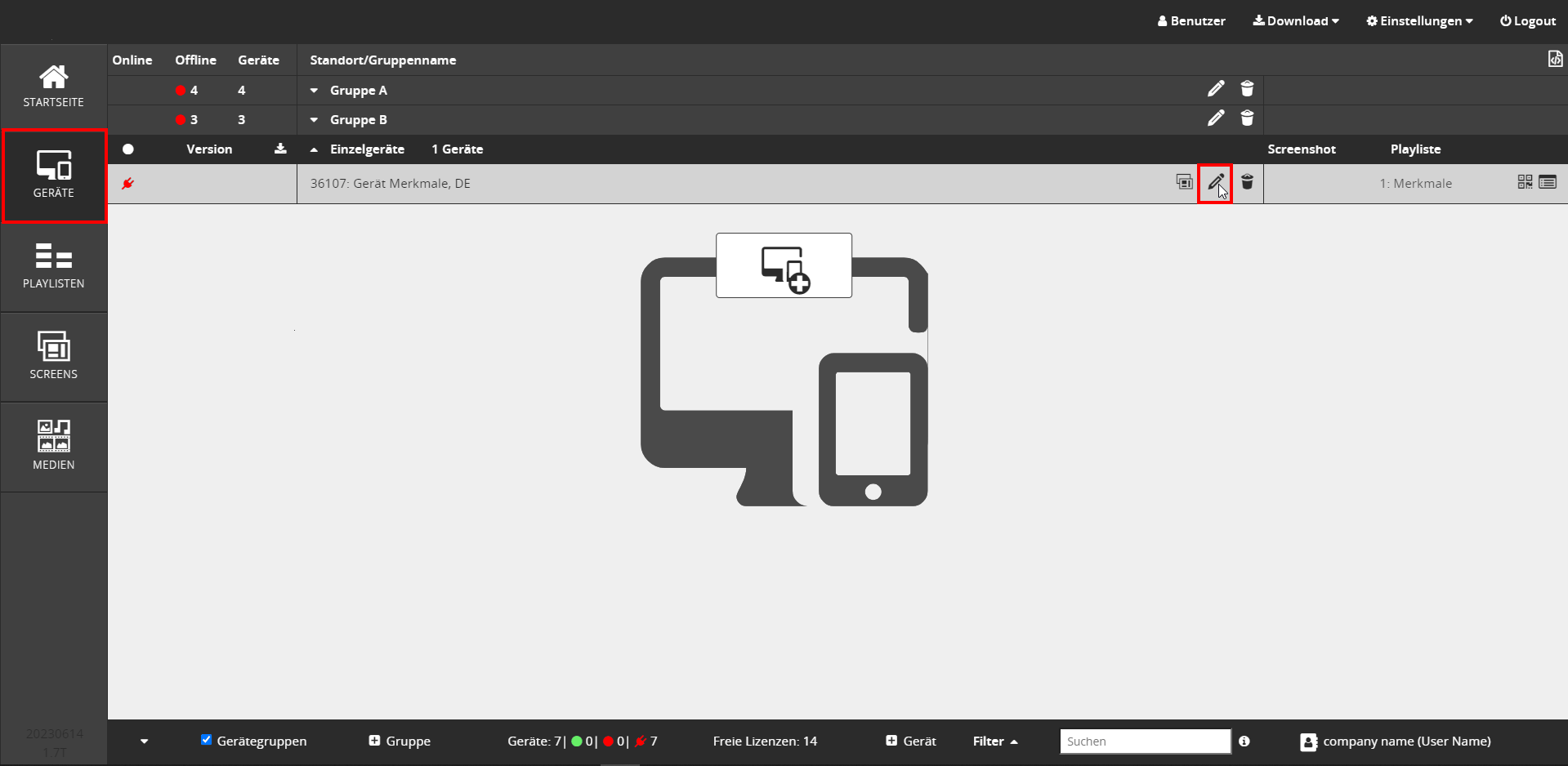 - Wählen Sie in der Geräteverwaltung das Gerät aus, für das Sie ein Merkmal anlegen möchten und klicken Sie auf Gerät bearbeiten →