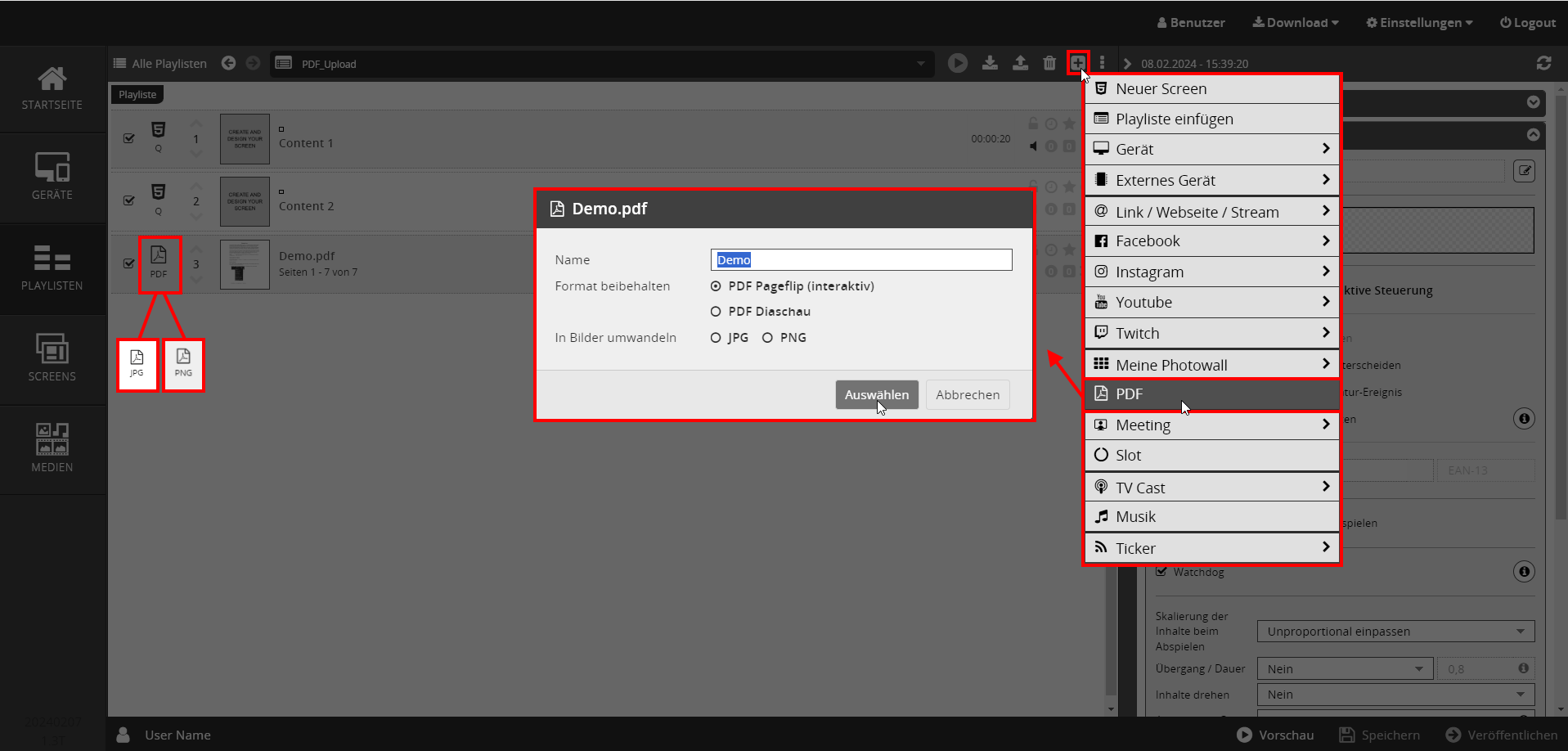 Mit der Funktion PDF erhalten Sie die Möglichkeit Ihre erstellten Dokumente (z.B. aus einem Office-Programm) originalgetreu in Ihren Playlisten darzustellen.