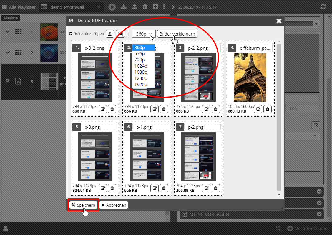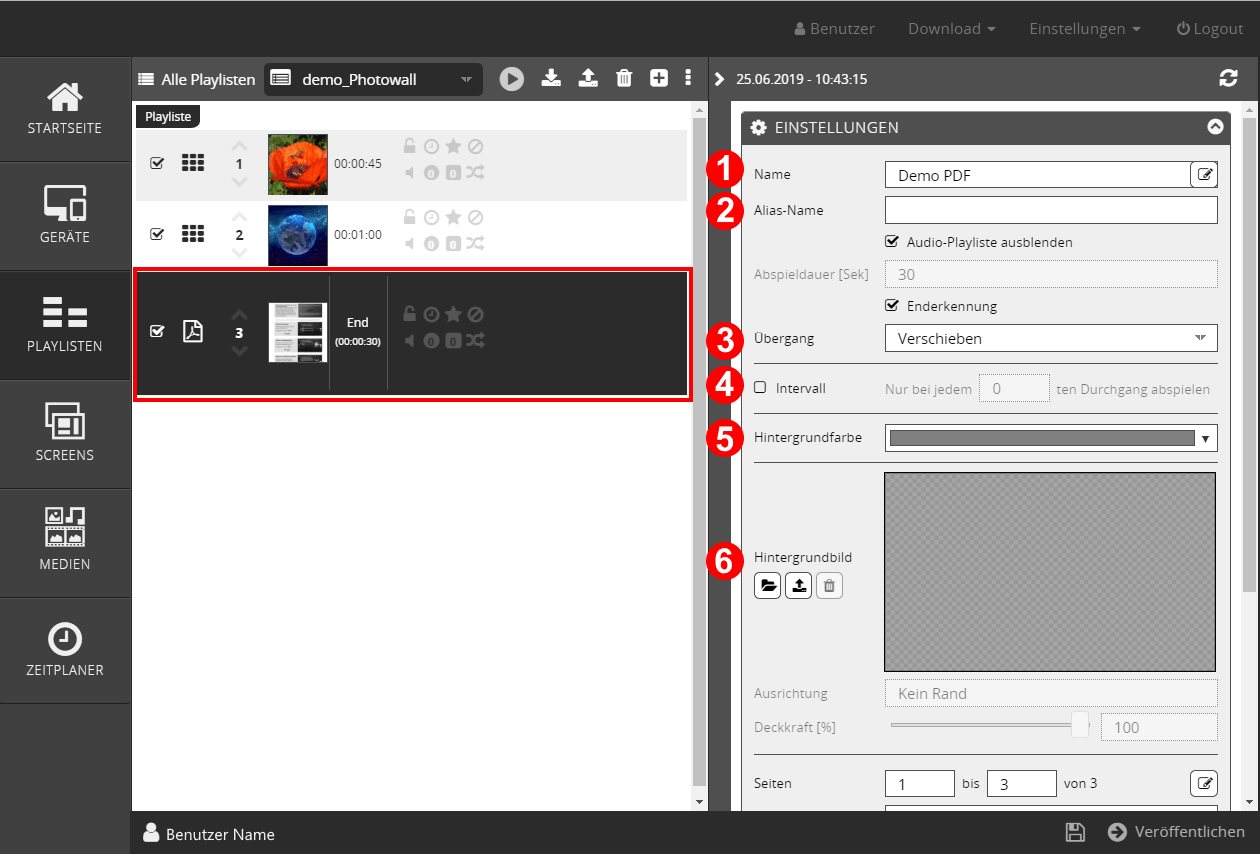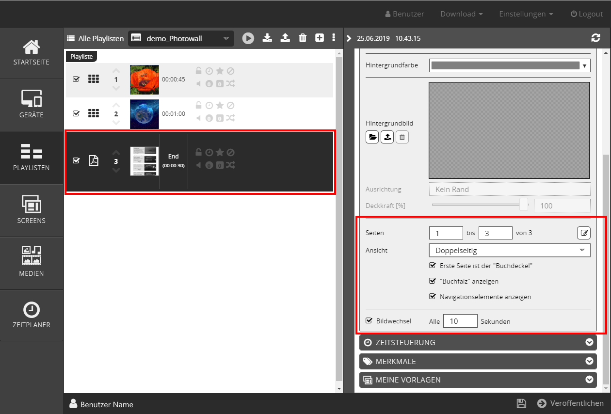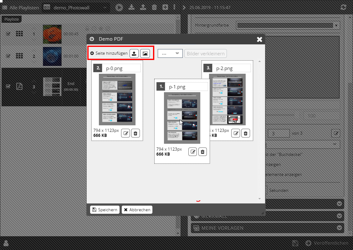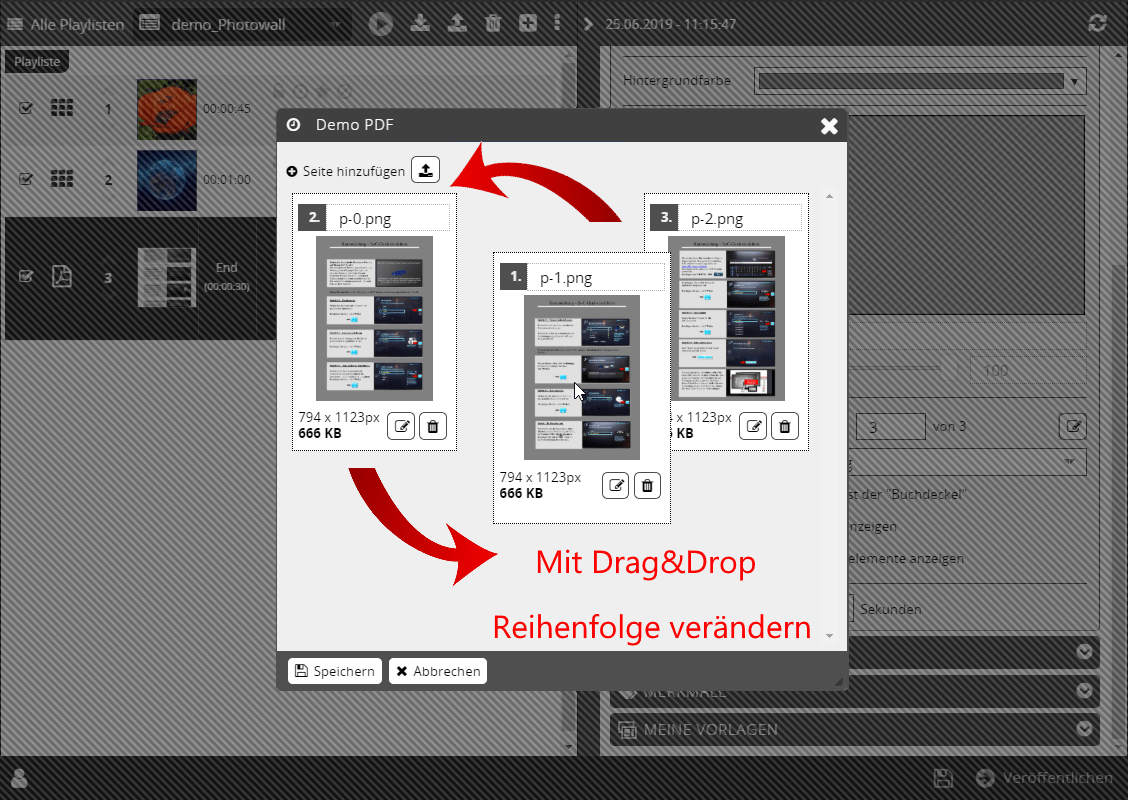 Nach Erstellung einer PDF Datei können Sie diese in Ihre Playliste hochladen oder schnell und einfach per Drag and Drop einfügen.