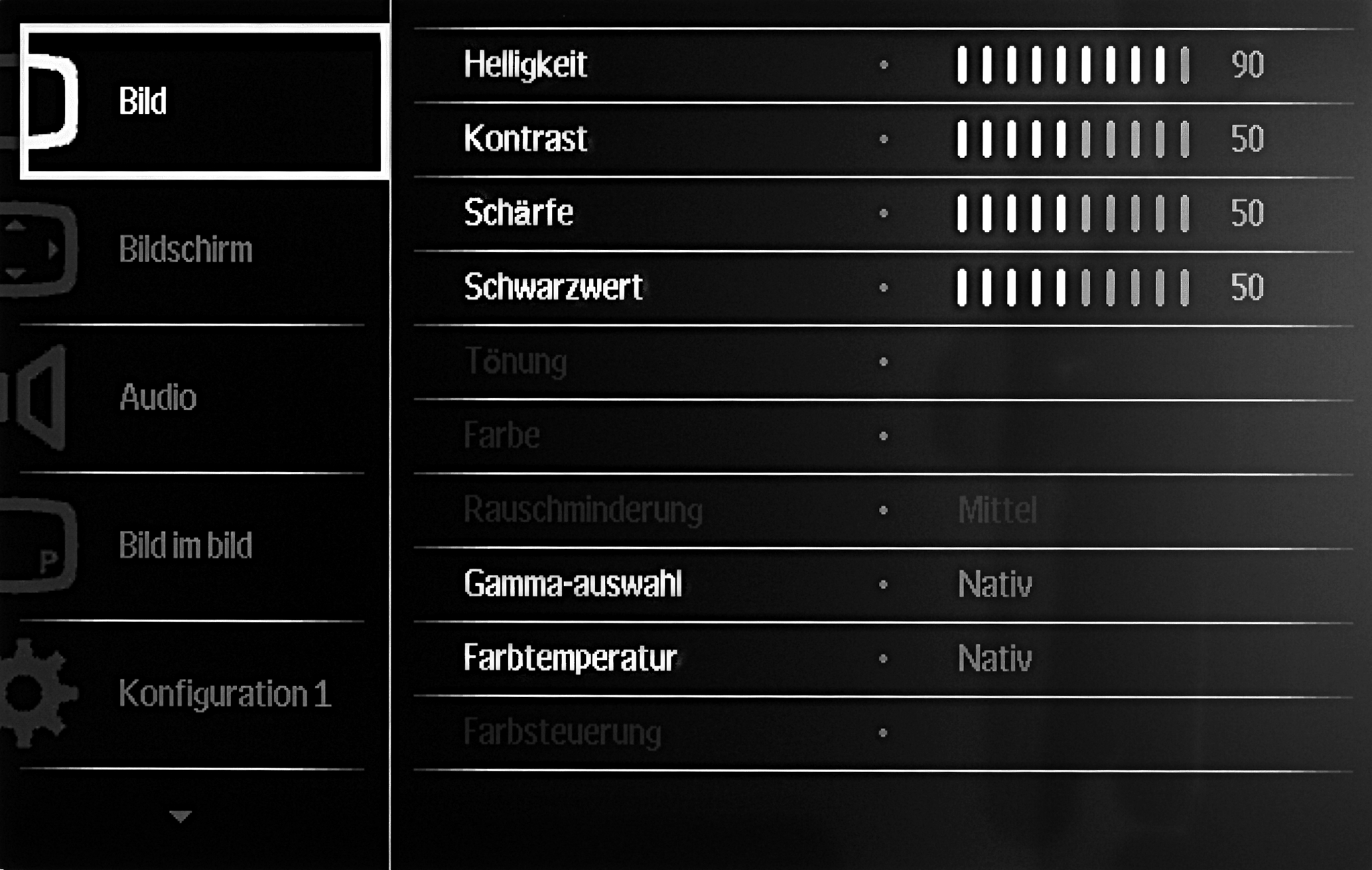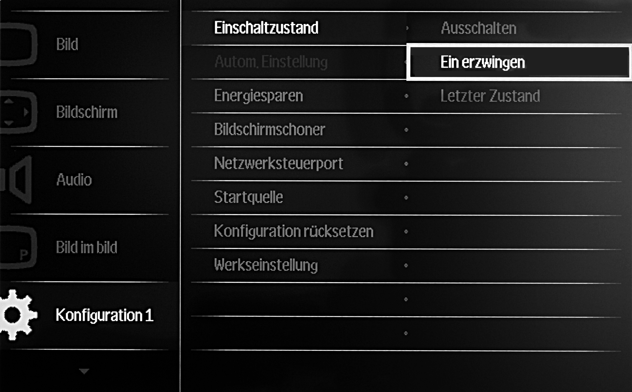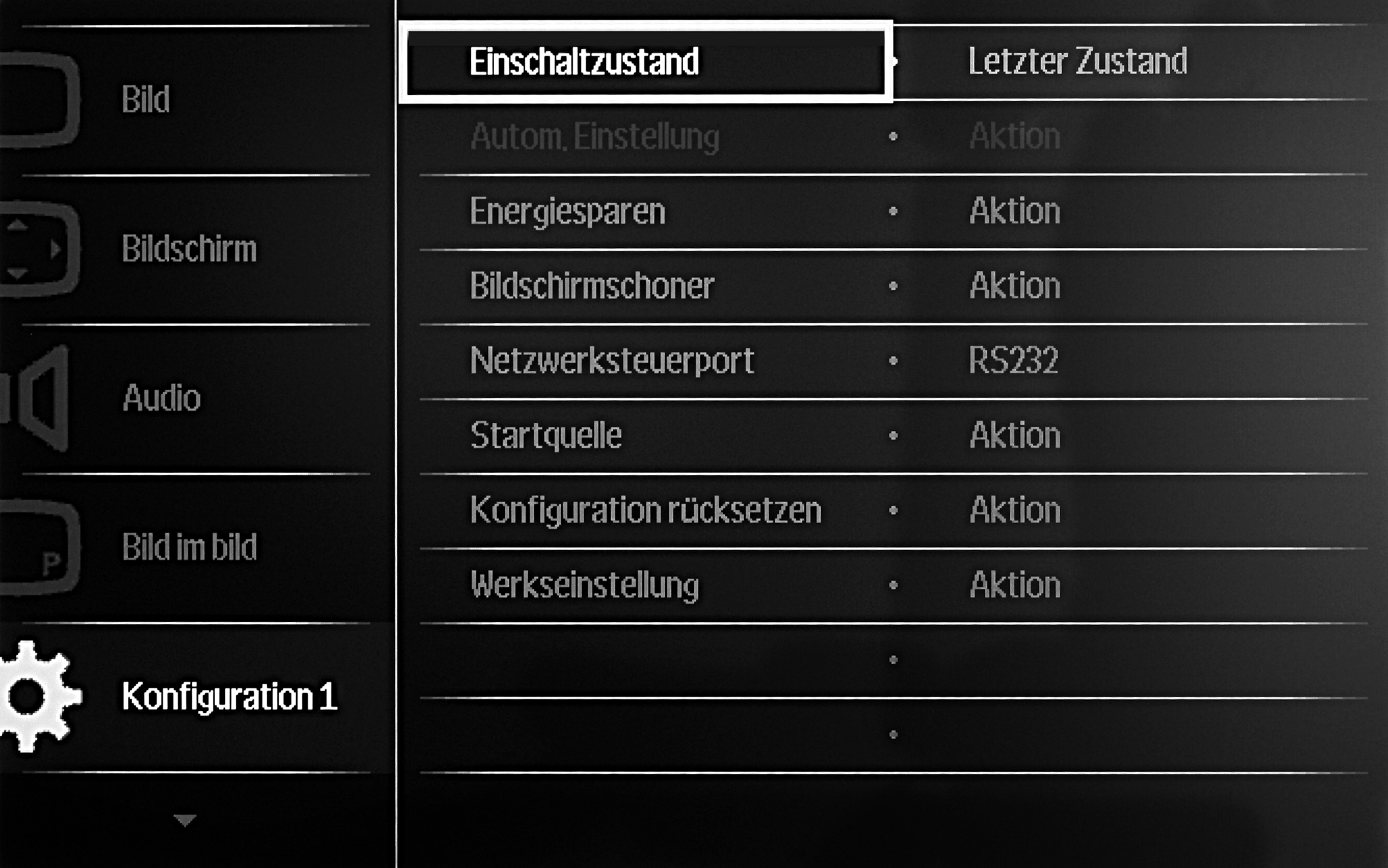 - Gehen Sie mit den Pfeiltasten der Fernbedienung des Gerätes in der linken Spalte des Menüs auf den Menüpunkt → Konfiguration 1.