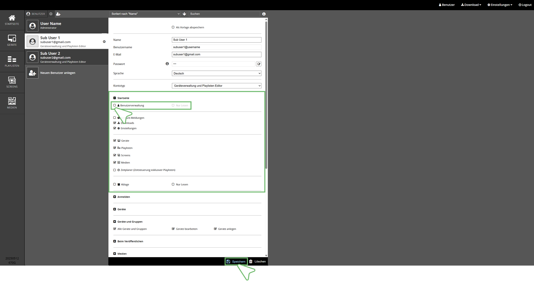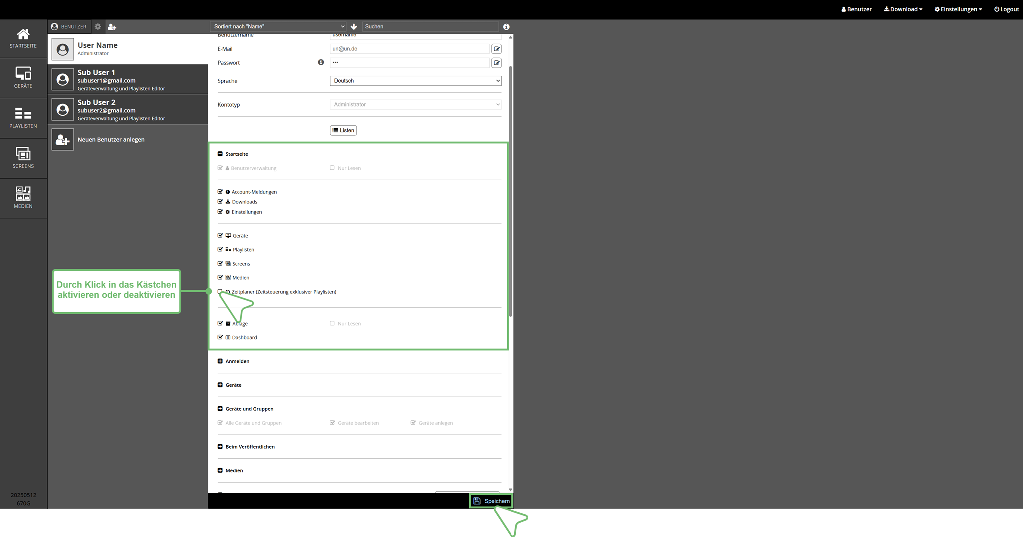 Im Bereich Startseite ist für Sie als Administrator wichtig, dass Sie stets Zugriff auf den Arbeitsbereich Benutzerverwaltung haben. Deshalb ist in Ihren Einstellungen dieser Bereich immer aktiviert. Die Arbeitsbereiche Account-Meldungen, Downloads und Einstellungen im Header der Cloud Software können Sie bei Bedarf durch einen Klick in das jeweils vorangestellte Kästchen an- oder abschalten. Gleiches gilt für die Menüpunkte Geräte, Playlisten, Screens, Medien, Zeitplaner, Ablage und Dashboard.Unterbenutzer Einstellungen