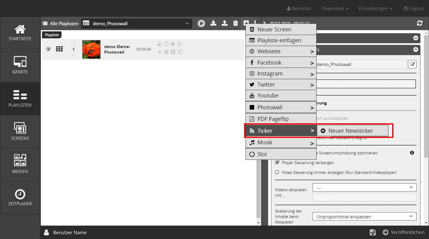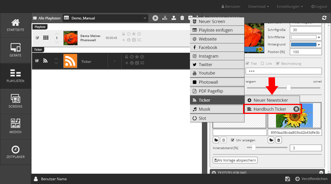 in Playlisten - Wählen Sie den Menüpunkt Ticker einfügen