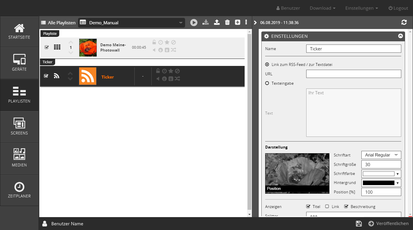 Der Klick auf den Menüpunkt Neuer Newsticker stellt in der Playliste zunächst einen Platzhalter für den Inhalt zur Verfügung und einen entsprechenden Einstellungen-Bereich auf der rechten Seite.