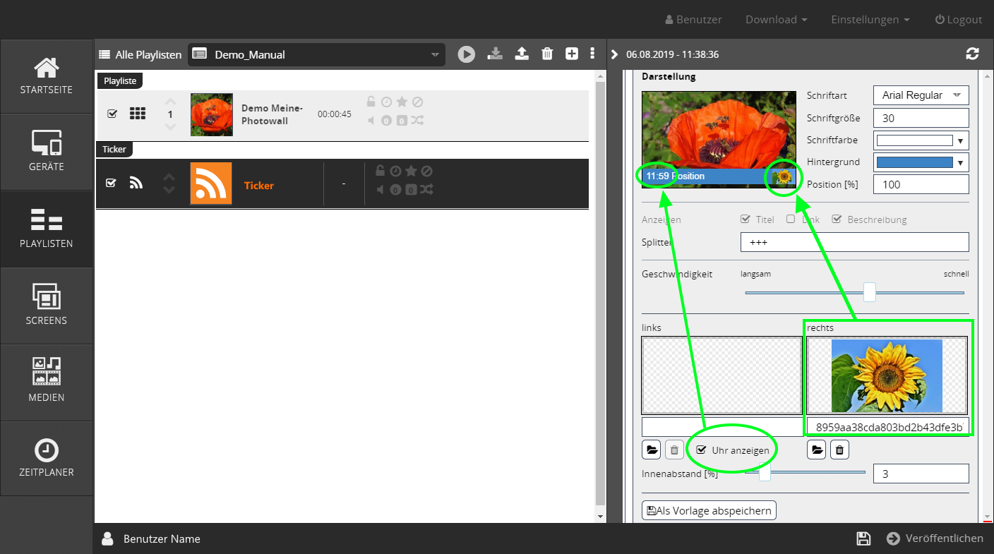 Alle von Ihnen in der Zeitsteuerung getätigten Eingaben können Sie in der Playlistenzeile des jeweiligen Tickers sehen.
