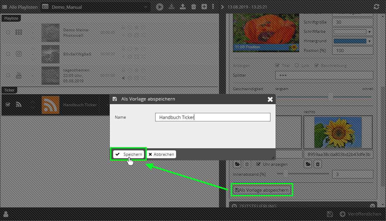 Erstellen Sie aus den getätigten Einstellungen eine Ticker-Vorlage, um die Einstellungen für weitere Ticker zu verwenden.