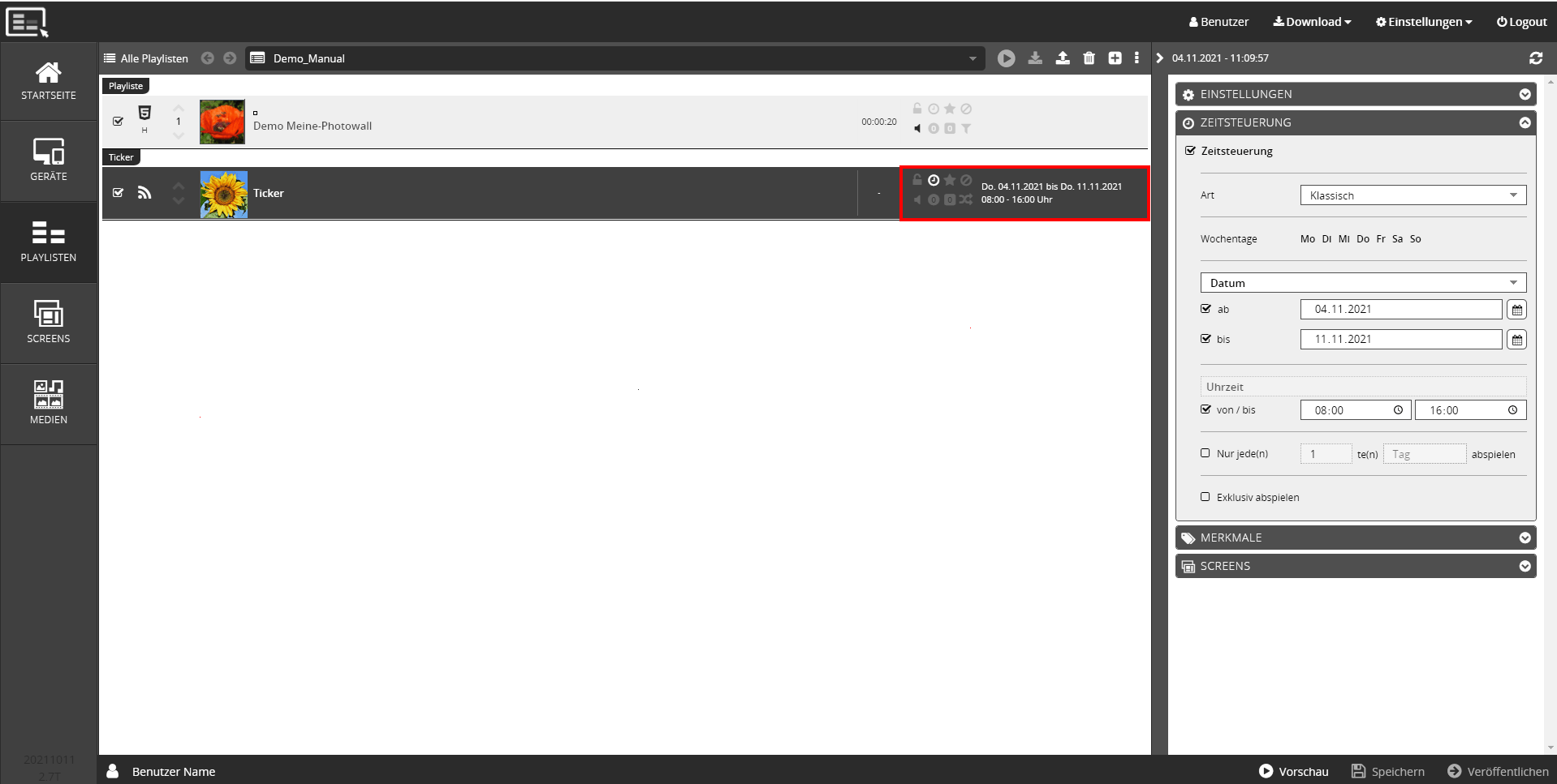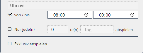 Wird keine Einstellung in der Zeitsteuerung getätigt, wird der Ticker während der gesamten Playlistenlaufzeit angezeigt.
