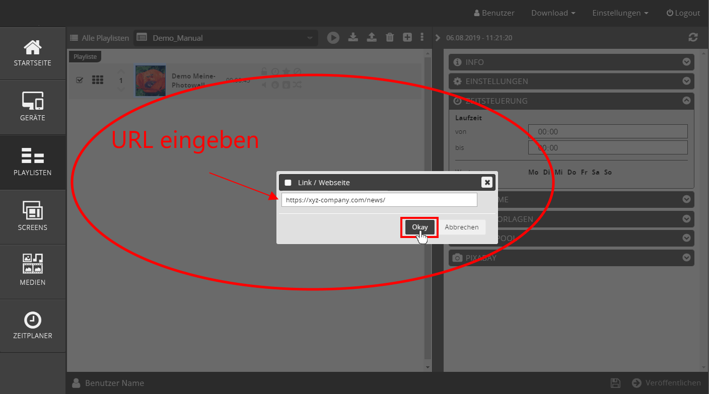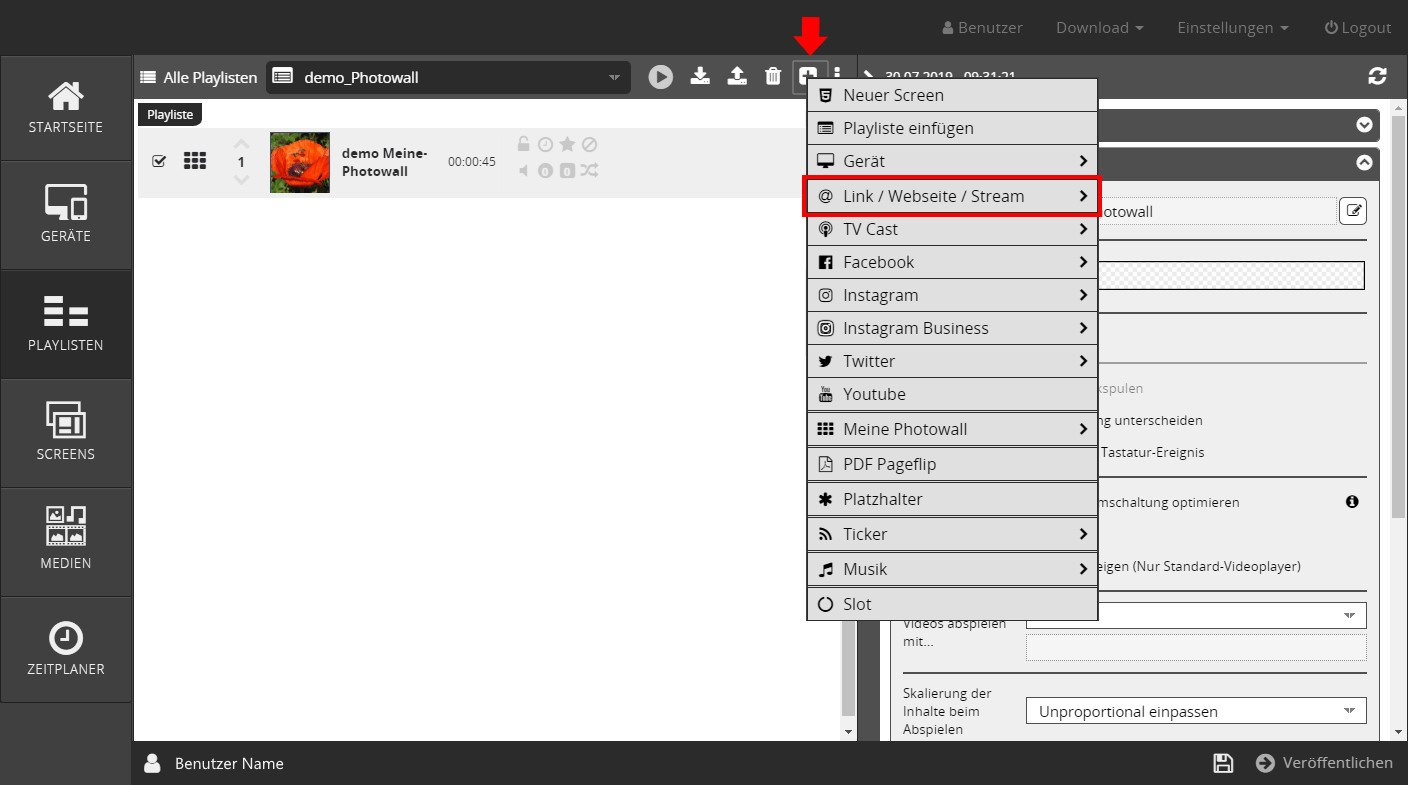 Neben der Skalierung für Webseiten innerhalb eines Screens, steht Ihnen diese Funktion auch für Webseiten in der Playliste zur Verfügung.