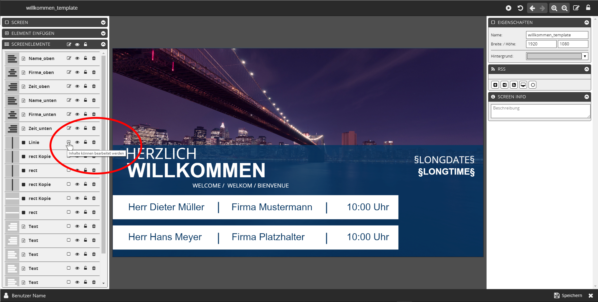 Es werden nur Elemente in die XML übernommen, die Sie vorher für eine Bearbeitung zur Verfügung stellen. Die Einstellung dazu nehmen Sie auf der linken Seite in der Auflistung der Screenelemente vor. Zu diesem Zweck setzen Sie in der jeweiligen Elementzeile einen Haken in das Kästchen →