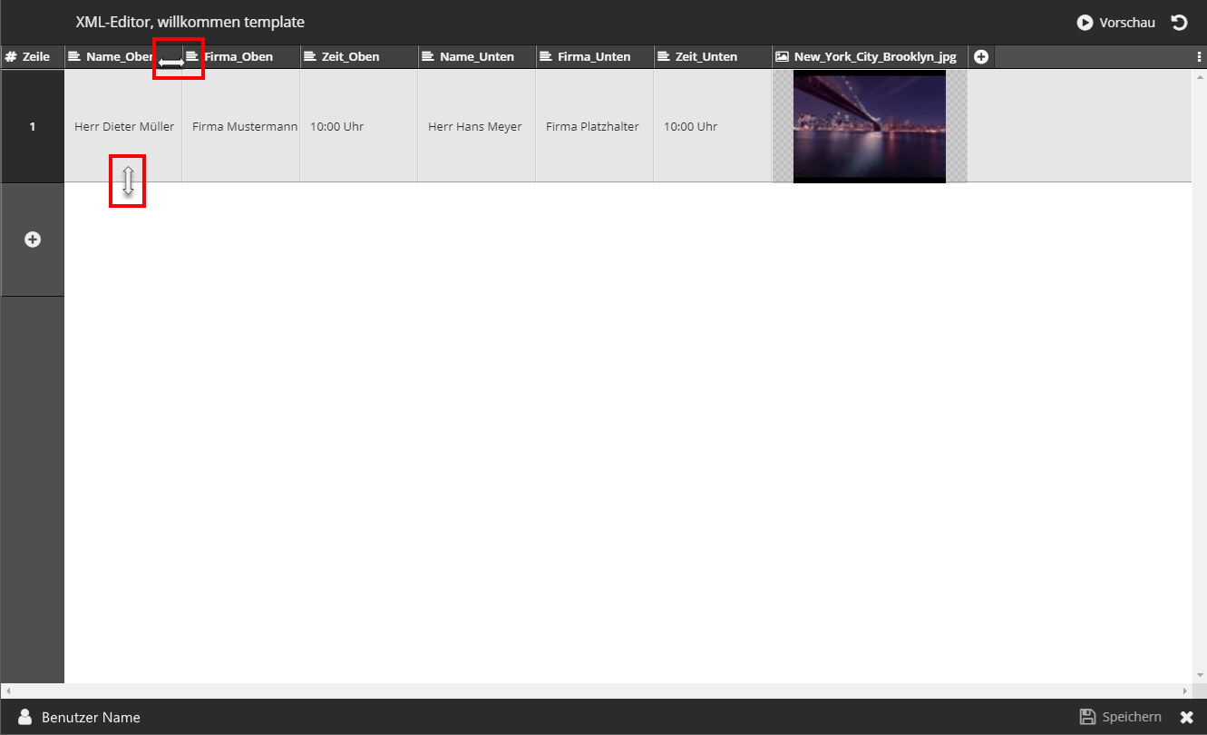 Die von Ihnen vor Erstellung der XML-Datei als bearbeitbar bestimmten Einträge finden Sie hier jeweils in einer eigene Spalte gelistet.