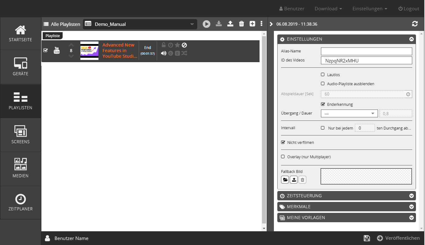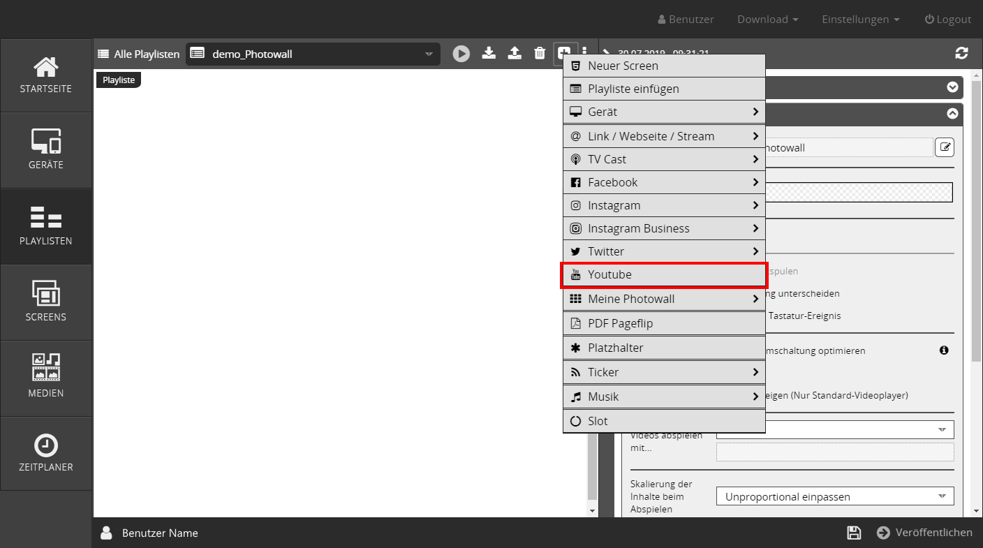 Der Klick auf den Menüpunkt Youtube stellt in der Playliste einen Platzhalter für den Inhalt zur Verfügung und es öffnet sich der entsprechende Einstellungen-Bereich auf der rechten Seite.